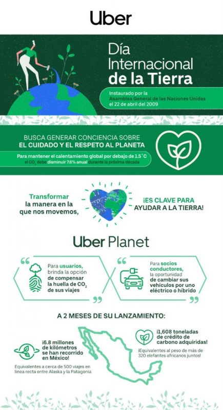 En el marco del Día Internacional de la Tierra, Uber refrenda su compromiso con la movilidad y con las ciudades de México a través de innovaciones e inversiones tecnológicas que generen esquemas de traslado multimodales, sostenibles y verdes, que a su vez propicien la construcción de lugares más sanos y ecológicos a favor de las personas.
