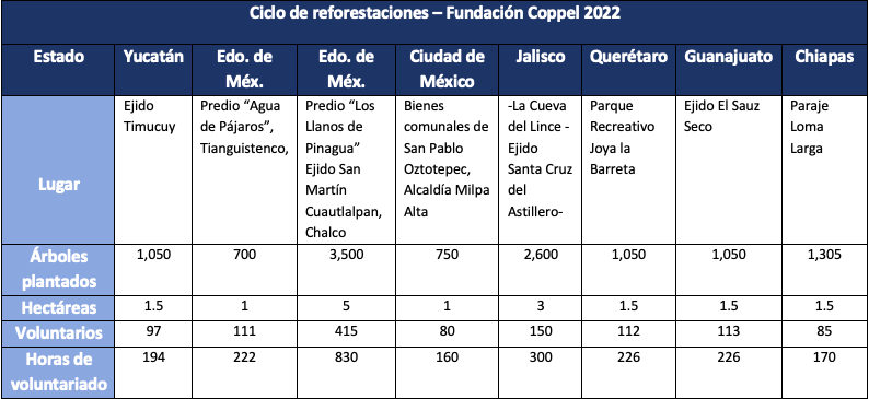 Fundación Coppel, Sostenibilidad y ASG de Grupo Coppel, en alianza con Reforestamos México A.C., concluyó su ciclo de reforestaciones, a través de la iniciativa “Mejores Alianzas, Mejores Bosques” (MAMB), en la cual 1,164 colaboradores de Coppel destinaron 6,984 horas de voluntariado para la intervención de ocho áreas verdes en la República Mexicana.
