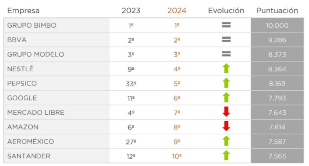 Actualmente, Grupo Bimbo es la empresa con mayor capacidad para fidelizar el talento de sus colaboradores, seguida de BBVA (2ª) y Grupo Modelo (3ª). Completan el top ten: Nestlé (4º), PepsiCo (5º), Google (6º), Mercado Libre (7º), Amazon (8º), Aeroméxico (9º) y Santander (10º).