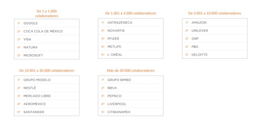 Según el número de colaboradores, en empresas de 1 a 1.000 colaboradores, Google ocupa el primer lugar como empresa con mayor capacidad para atraer y fidelizar talento; mientras AstraZeneca hace lo propio en las de entre 1.001 a 3.000 colaboradores; Amazon, en las de entre 3.001 y 10.000 colaboradores; Grupo Modelo, en las de entre 10.001 y 30.000 colaboradores, y Grupo Bimbo, en las compañías con más de 30.000 colaboradores.