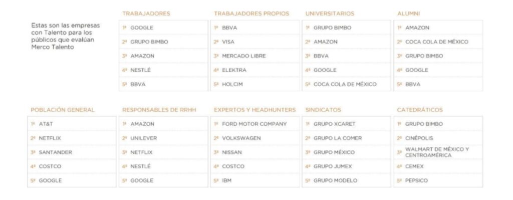Según los públicos que evalúan las empresas con talento, Google es la mejor valorada por los trabajadores; mientras que BBVA lo es para los trabajadores propios, Grupo Bimbo para los universitarios y los catedráticos, Amazon para alumni y para los responsables de RRHH, AT&T para la población general, Ford Motor Company para los expertos y headhunters, finalizando con Grupo Xcaret para los sindicatos.