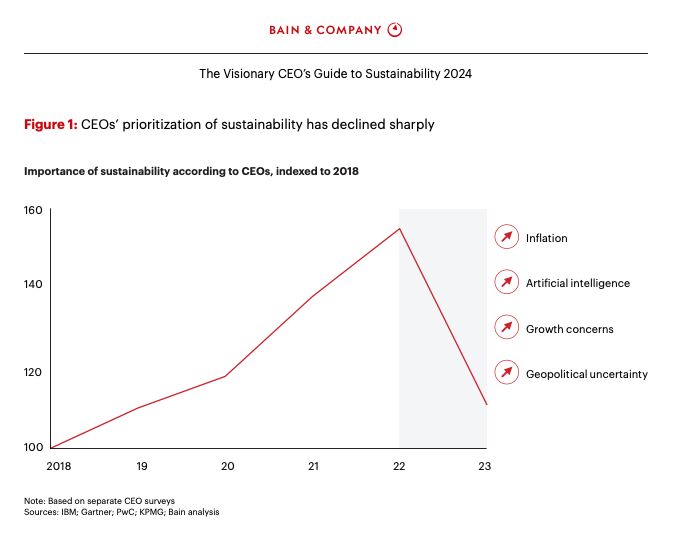 En un mundo donde los efectos del cambio climático son cada vez más evidentes, la sostenibilidad debería ser un tema prioritario en la agenda de las empresas. Sin embargo, el reciente estudio de Bain & Company, “The Visionary CEO’s Guide to Sustainability 2024”, presenta un dato revelador: la priorización de la sostenibilidad ha disminuido entre los CEOs. Esto puede sorprender a muchos, pero no significa que el tema haya perdido su relevancia. Ahí radica el verdadero problema: la miopía de algunos líderes empresariales es asombrosa.