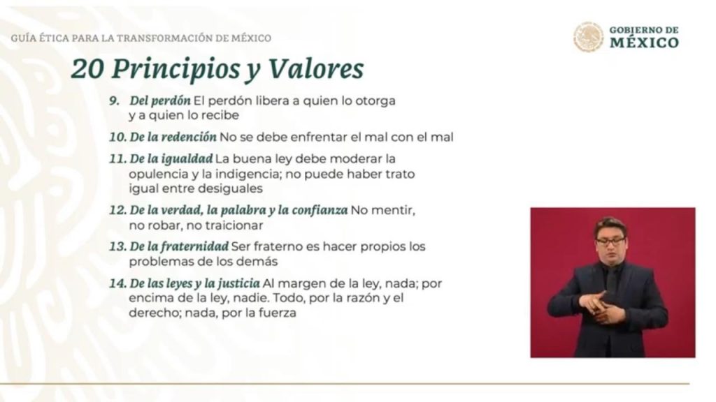 Este documento será similar a la Cartilla Moral de Alfonso Reyes, indicó en la presentación, se trata del compromiso 99 que realizó al tomar posesión de la Presidencia de la República y contiene 20 principios que establecen la importancia de los valores y el comportamiento apegado a normas éticas.