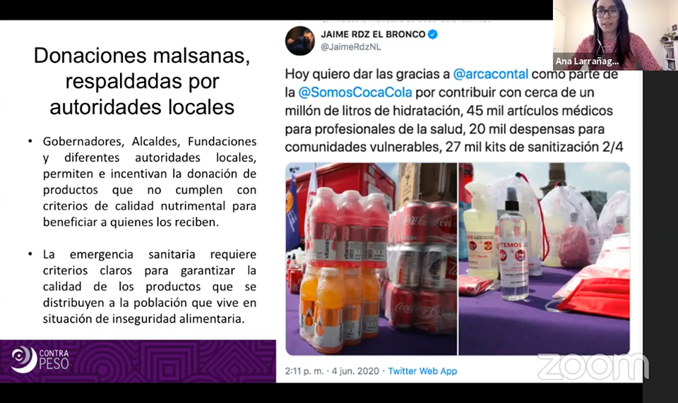 Como ejemplo se señaló que la empresa Coca-Cola ha canalizado donaciones entre las que se observan bebidas con alto contenido de azúcar o productos ultraprocesados. Incluso las donaciones son agradecidas publicamente por autoridades y referidas como “litros de hidratación”.