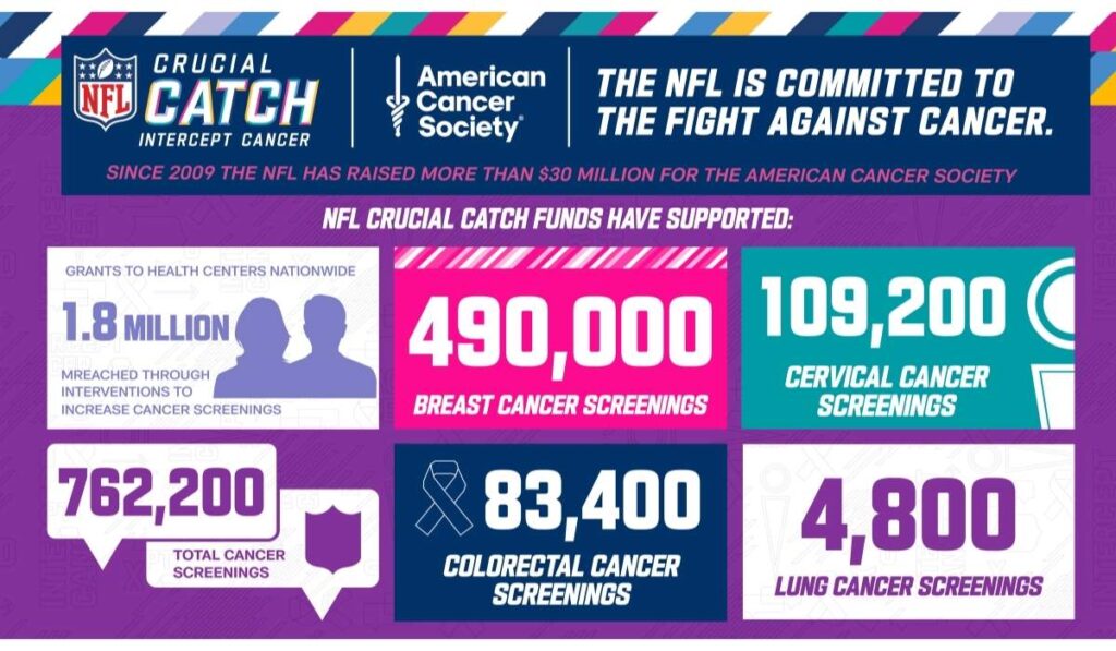 La NFL, una de las organizaciones deportivas más influyentes en el mundo, utiliza su alcance masivo para promover el mensaje de la detección temprana, y organiza campañas anuales durante sus partidos para resaltar la importancia de la prevención. Los jugadores, entrenadores y equipos llevan indumentaria y accesorios de colores que representan diferentes tipos de cáncer, y estos productos también están disponibles para la venta al público. Los fondos recaudados se destinan a la Sociedad Americana contra el Cáncer para financiar programas de detección y educación.