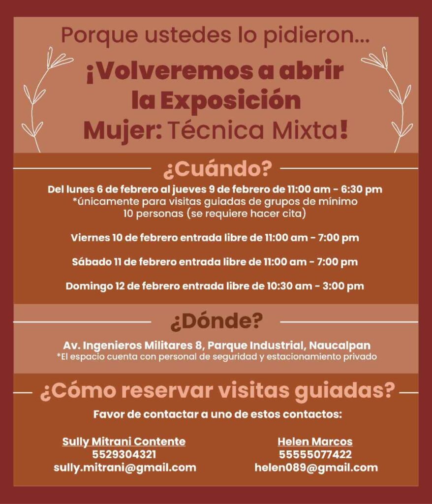 Si tú también te quieres sumar, conocer el libro y ayudar a encontrar nuevas formas de romper roles de género, acércate a las redes sociales de Mujer: Técnica Mixta, hallarás la forma de adquirirlo y ser parte de… Además, gracias al apoyo y entusiasmo de todos los y las visitantes la exposición mencionada fue un gran éxito; por ello habrá una segunda fecha: del 6 al 12 de febrero, para que la puedan visitar de nuevo o acudir quienes no lograron ir en las fechas anteriores. ¡Te dejamos más datos a continuación!