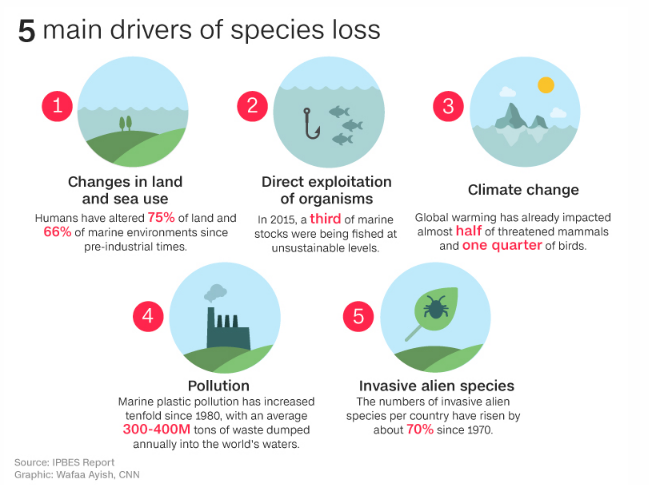 El resumen de 39 páginas del reporte destaca varias formas en que las personas están reduciendo la biodiversidad: