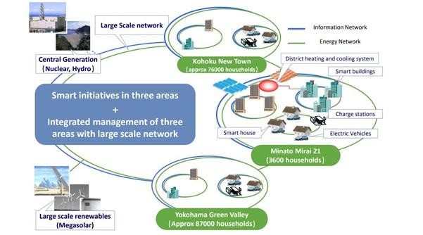Muchas ciudades han adoptado las energías renovables y una red inteligente para mejorar la confiabilidad, resistencia, flexibilidad y eficiencia de sus sistemas de suministro de energía. En 2010, la ciudad de Yokohama formuló el Proyecto Ciudad Inteligente de Yokohama (YSCP) que introdujo un Sistema de Gestión de Energía Comunitaria (CEMS) al vincular cada SGA, como hogares, edificios y almacenamiento energético estacionario en tres áreas. Junto con iniciativas de energía renovable y vehículos eléctricos, los consumidores también recibirán incentivos para limitar el uso de electricidad. YSCP contribuye con el objetivo de la ciudad: reducir las emisiones de carbono en un 16% para 2020, un 24% para 2030 y un 80% para 2050.