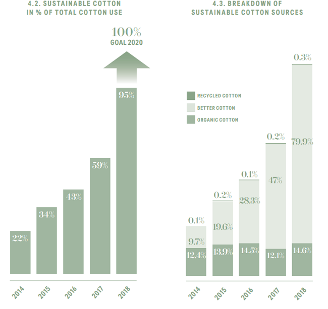 En 2018, este fue el caso del 57% de todos los materiales, lo que representa un aumento del 35% en un año. La cifra equivalente para el algodón fue del 95%, cerca del objetivo de la compañía de alcanzar el 100% el año próximo.