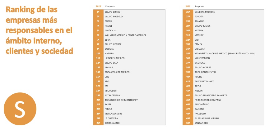 Ranking de las empresas más responsables en el ámbito interno, clientes y sociedad (S)