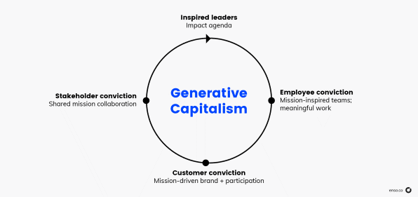 Los líderes inspirados pueden crear un impulso hacia adelante para sus organizaciones de manera mucho más eficiente, tanto en el impacto social como en el financiero. Estas organizaciones contribuyen más al mundo de lo que extraen. Se piensa en esto como un capitalismo generativo, distinto del capitalismo extractivo que resulta de líderes con una orientación de riqueza y poder. El capitalismo generativo aporta un nuevo valor al mundo y el capitalismo extractivo reasigna el valor existente.