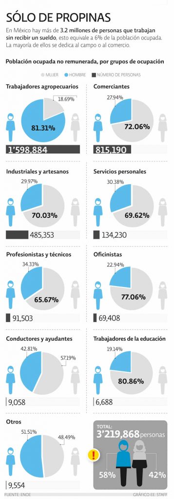 Lo anterior significa que estos 3.2 millones de trabajadores, tienen un empleo, pero no perciben un salario base. Por esta razón, su ingreso es variable y no cuentan con prestaciones laborales.
