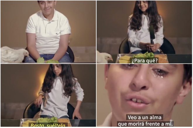 Tanto el niño como la niña, entran en una especie de pánico y no pueden evitar llorar. Una voz en off entra y dice: “esto es lo que hacemos para comer carne y pollo. Debes matarlos para comerlos”.