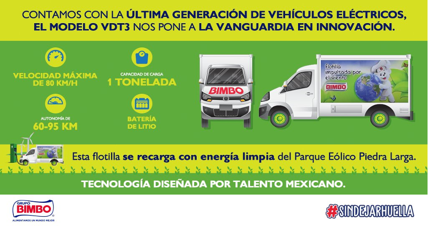 Lo anterior ha permitido a Grupo Bimbo contar con la flotilla de autos eléctricos más grandes de México, y una de las más extensas de América Latina. Esta se alimenta de energía que proviene del parque eólico Piedra Larga, ubicado en Oaxaca y algunos de los sistemas Bimbo Solar, que la compañía ha instalado en sus centros de venta.
