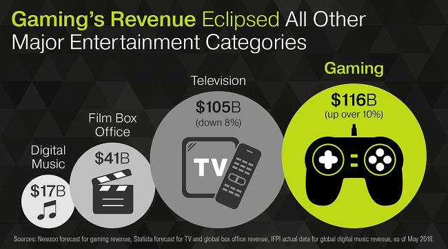 Según un reporte de Reuters, el año pasado la industria de los videojuegos produjo un ingreso estimado de 116 mil millones de dólares, superando a los servicios de transmisión de TV de 105 mil millones de dólares.