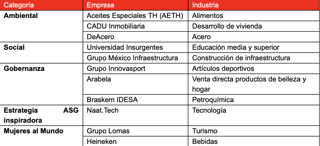 En esta edición 2024 el jurado calificador reconoció a 11 estrategias empresariales Ambientales, Sociales y de Gobernanza (ASG). Este número incluye a la estrategia que obtuvo el galardón como ASG Inspiradora, para empresas pequeñas y medianas, y dos menciones honoríficas con enfoque de género “Mujeres al Mundo”.