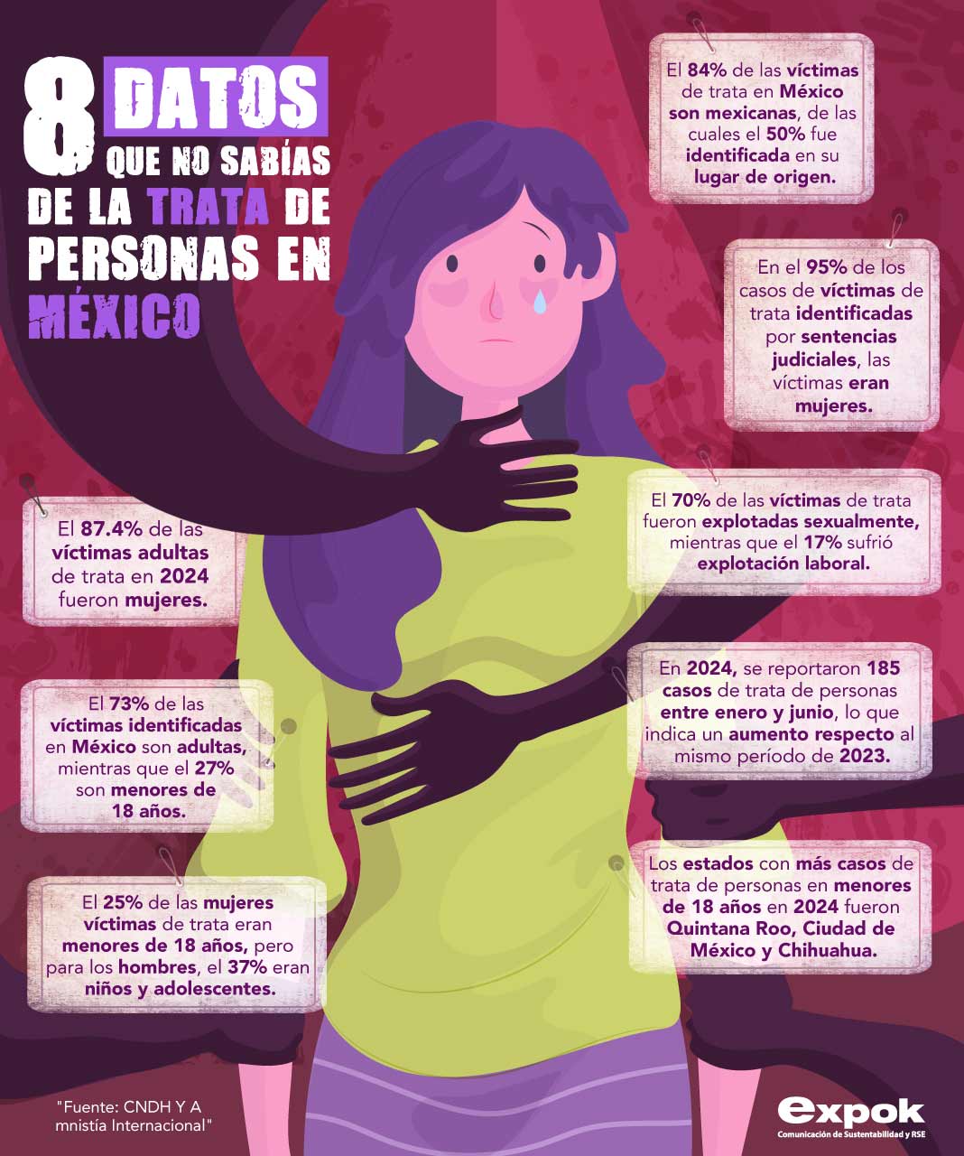 La trata de personas en México es una de las violaciones más graves a los derechos humanos que enfrenta nuestro país. Como lo muestra la infografía, el tipo de población más afectada son las mujeres y menores de edad, mientras que el 70% de las víctimas de este crímen son explotadas sexualmente y el 17% sufre de explotación laboral. Esta realidad exige atención urgente para proteger a quienes están en mayor riesgo.