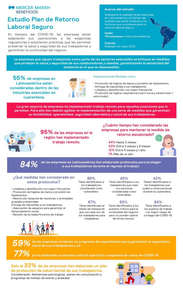 Durante el mes de mayo, Mercer Marsh Beneficios desarrolló un estudio sobre el retorno laboral seguro, en 11 países de Latinoamérica y el Caribe. Esta encuesta analiza la realidad de más de 700 empresas de la región en tiempos del COVID-19, las medidas que están tomando y los factores que consideran para un retorno laboral seguro, adaptando sus operaciones a las exigencias regulatorias y adoptando prácticas que les permitan garantizar la seguridad de sus colaboradores.