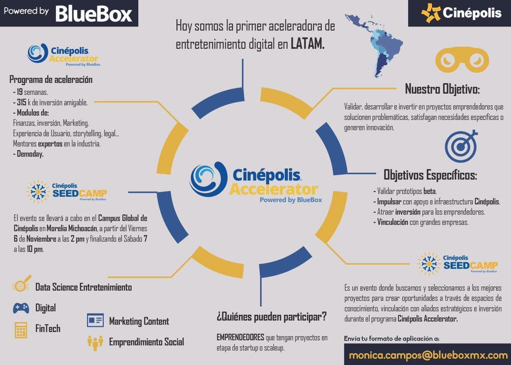Cinépolis Accelerator fue creado por Cinépolis y BlueBox en 2013. Su cuarta edición ya arrancó en las instalaciones de BlueBox, Ciudad de México. Ahí se recibieron a emprendedores de América Latina para colaborar durante cuatro meses con pilotos que se llevarán a cabo dentro del corporativo.