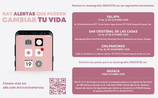 El recorrido de la Caravana Rosa ADO inicia el próximo lunes 1 de octubre de 2020 en Oaxaca y posteriormente, la unidad móvil especializada de FUCAM continuará su recorrido en San Cristóbal de las Casas, Chilpancingo y Xalapa.
