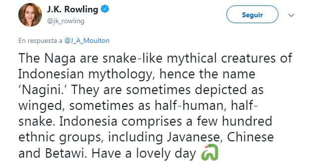 “Los Naga son criaturas míticas parecidas a serpientes de la mitología de Indonesia, de ahí el nombre ‘Nagini’. A veces se representan como alados, a veces como mitad humanos, mitad serpiente. Indonesia comprende unos pocos cientos de grupos étnicos, incluidos los javaneses, chinos y Betawi. Tengan un día precioso”.