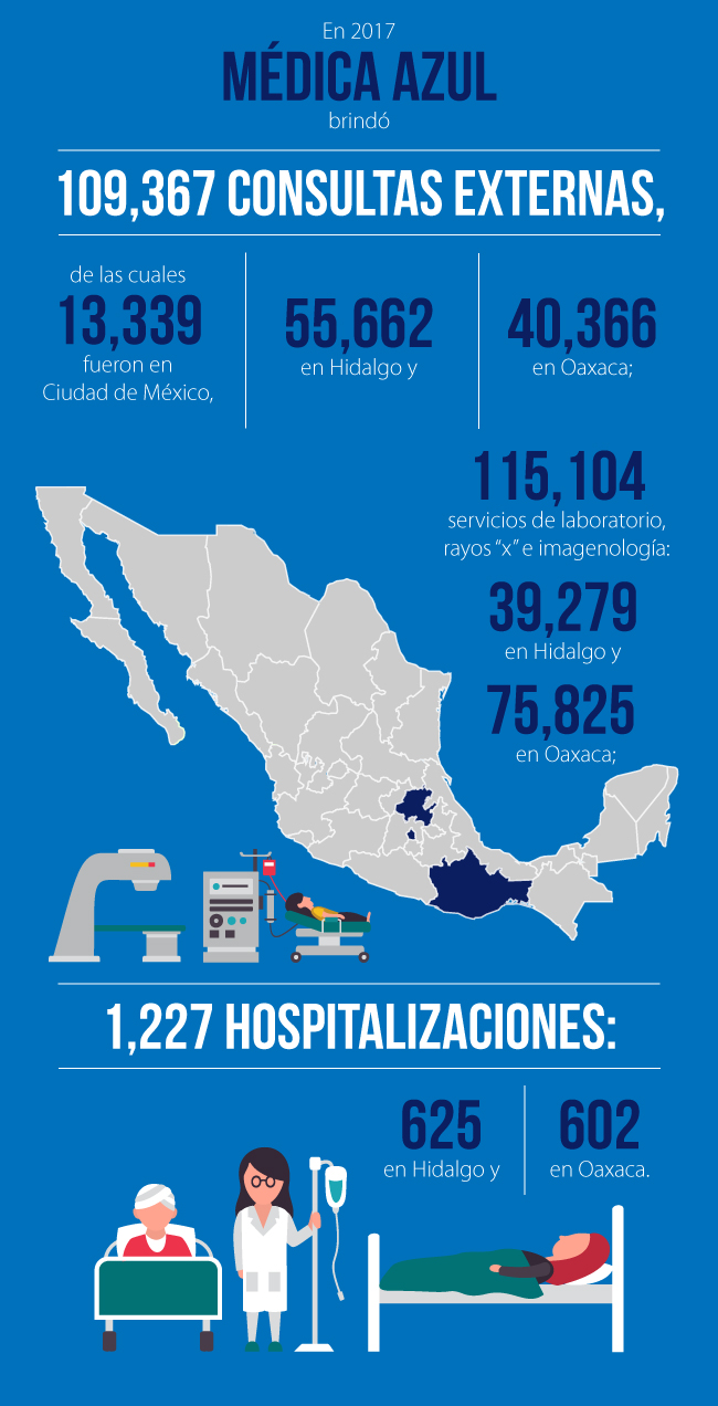 Son dos Hospitales Generales de Médica Azul los que atienden a colaboradores y familiares de la Cooperativa, así como de las empresas del Núcleo y Grupo Cruz Azul, y a los habitantes de las comunidades circundantes a las instalaciones de Laguna, Oaxaca y Cruz Azul, Hidalgo.