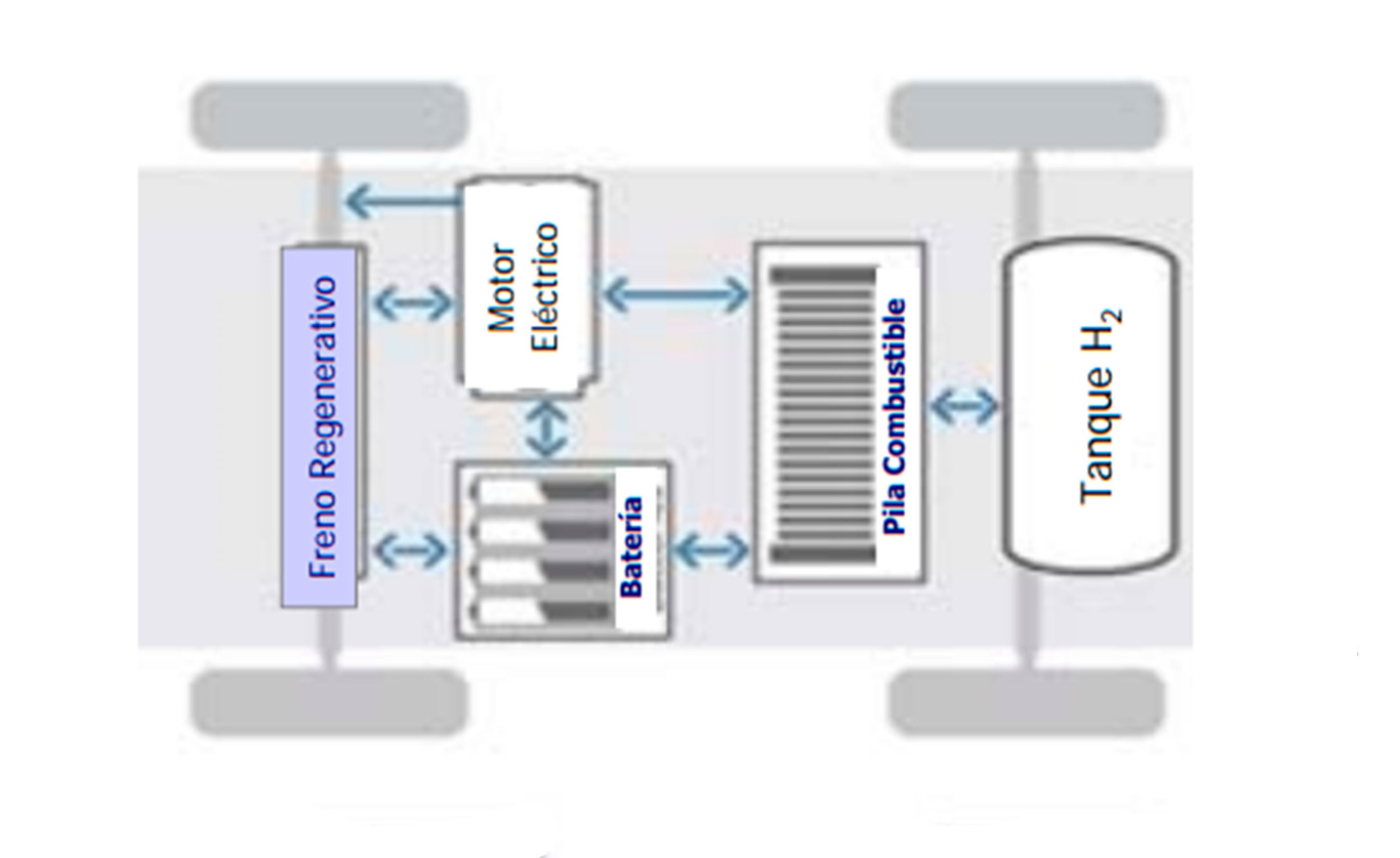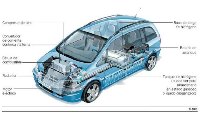 Dentro de esta pila se combina el oxígeno e hidrógeno que genera energía eléctrica y agua; los coches de hidrógeno sólo emiten vapor de agua por el tubo de escape.