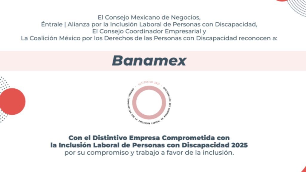 En Banamex, el compromiso con la diversidad e inclusión es primordial para sus operaciones y comunidad. Muestra de esto es que por octavo año obtuvo el Distintivo Éntrale, como “Empresa Comprometida con la Inclusión Laboral de Personas con Discapacidad” un reconocimiento que valida los esfuerzos por construir una cultura organizacional inclusiva, equitativa y comprometida con las Personas con Discapacidad (PcD) y Neurodiversidad (ND).