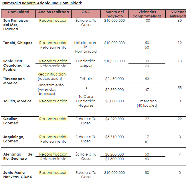 A un año de implementar el Programa Banorte Adopta una Comunidad en apoyo a las familias afectadas por los sismos de septiembre de 2017, Grupo Financiero Banorte ha entregado el 100% de los 30 mdp donados por clientes, colaboradores y público en general.