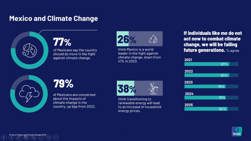 Mientras tanto, el 80% de los mexicanos considera que no actuar ahora es fallar a las futuras generaciones. Apenas el 26% cree que México es un líder mundial en la lucha climática, y solo el 38% percibe que exista un plan claro para actuar. En paralelo, solo el 25% confía en las afirmaciones ambientales de las empresas.
