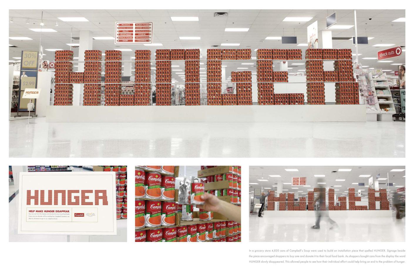 La agencia Leo Burnett de Toronto, Canadá, con las famosas latas de crema Campbells, formó la palabra “Hunger” y fomentó que los consumidores se llevarán una lata… minutos después, los responsables de la campaña mostraron como la palabra “Hunger” se puede borrar si todos participamos.