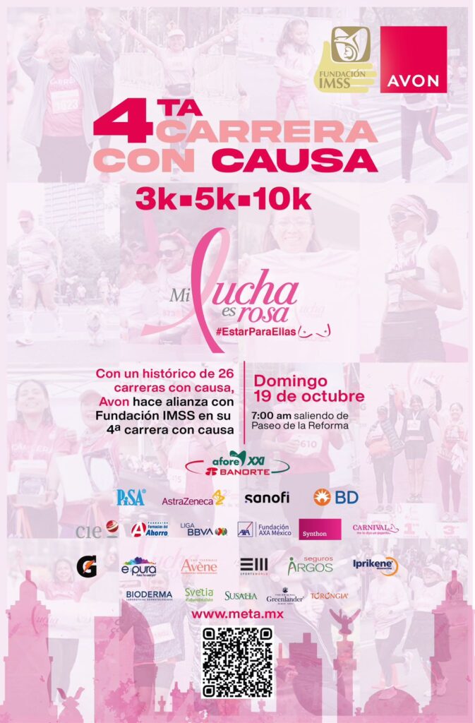 El próximo 19 de octubre, el Paseo de la Reforma se pintará de rosa con la 4° edición de la Carrera con Causa “Mi lucha es rosa”, un evento deportivo y solidario en el que, por primera vez, Fundación IMSS, Avon y la Fundación Instituto Natura se unen para fortalecer la detección oportuna del cáncer de mama en México.