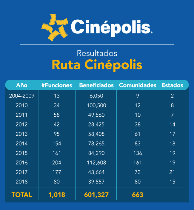 Este ha sido el objetivo principal de Ruta Cinépolis, un programa de responsabilidad social (RS) emprendido por Cinépolis y Fundación Cinépolis que ha compartido la experiencia cinematográfica con cientos de comunidades y miles de personas en distintas partes de la República Mexicana e incluso en otros países del continente.