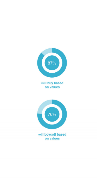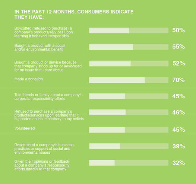 El estudio, que utilizó datos de referencia que datan de 1993, reveló que el 87 por ciento de los consumidores dijeron que comprarían un producto porque una empresa abogaba por un problema que les importaba y más del 75 por ciento se negaría a comprarlo si se enteraban una compañía apoyó un problema contrario a sus creencias. Según Whitney Dailey, directora de marketing e investigación en Cone Communications simplemente abordar los problemas dentro de la huella comercial ya no va a afectar a los consumidores.