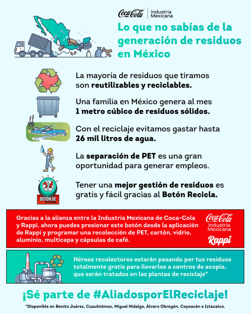 Y lo mejor es que lo hacen desde su hogar gracias al Botón Recicla. Esta herramienta digital surgió como resultado de la tecnología de Rappi y la experiencia con el manejo y tratamiento de distintos materiales por parte de la Industria Mexicana de Coca-Cola.