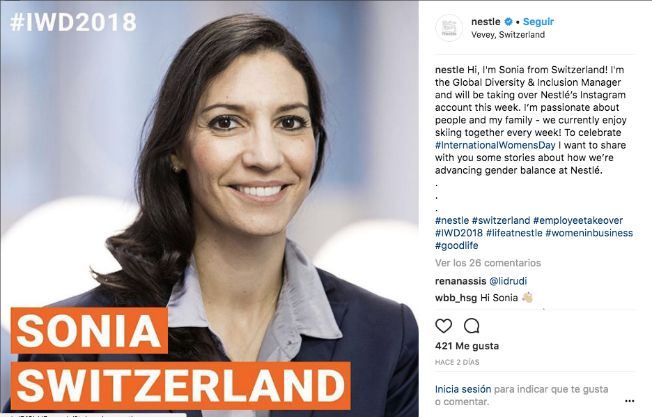 En el marco del Día Internacional de la Mujer, Nestlé hizo algo muy especial que se ha vuelto un ejemplo de cómo usar Instagram para RSE. La directora global de Diversidad e Inclusión de Nestlé es Sonia, quien esta semana fue la encargada de subir contenido a la red social de la empresa.