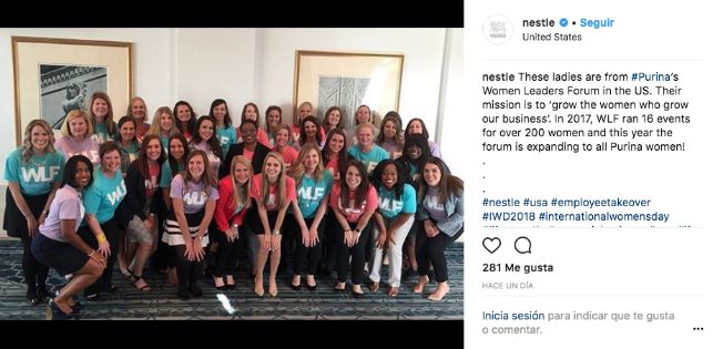 Uno de los equipos festejados en el Instagram de Nestlé, Día de la Mujer fue el de Women Leaders Forum (WLF) de Purina en los Estados Unidos, cuyo objetivo es “impulsar a las mujeres que impulsan nuestro negocio”. En 2017, el WLF de Purina organizó 16 eventos dirigidos a 200 mujeres.