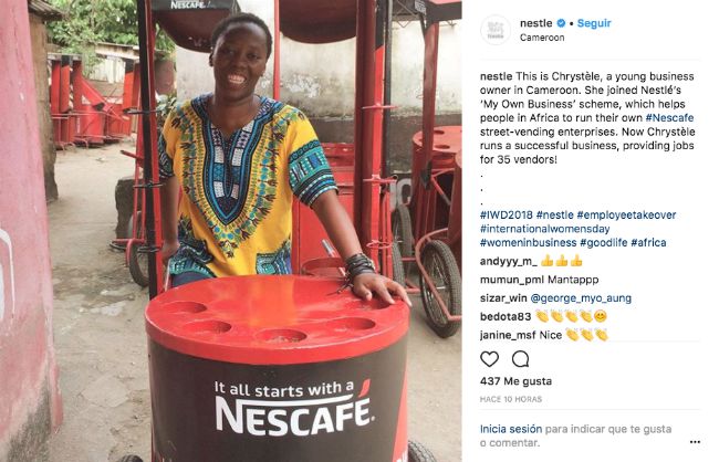 Chrystèle de Camerún es una de las mujeres beneficiadas con este programa y actualmente dirige su propio negocio ambulante en el que ha dado trabajo a 35 vendedores. Su historia fue contada en el Instagram de Nestlé, Día de la Mujer.