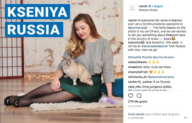Kseniya, especialista en Comunicaciones del equipo Purina en Rusia, fue una de las colaboradoras que manejó la cuenta y aprovechó no solo para hablar sobre su vida diaria y su trabajo en Nestlé, sino para invitar a las personas a mandar historias de sus mascotas, promoviendo la adopción y tenencia responsable.