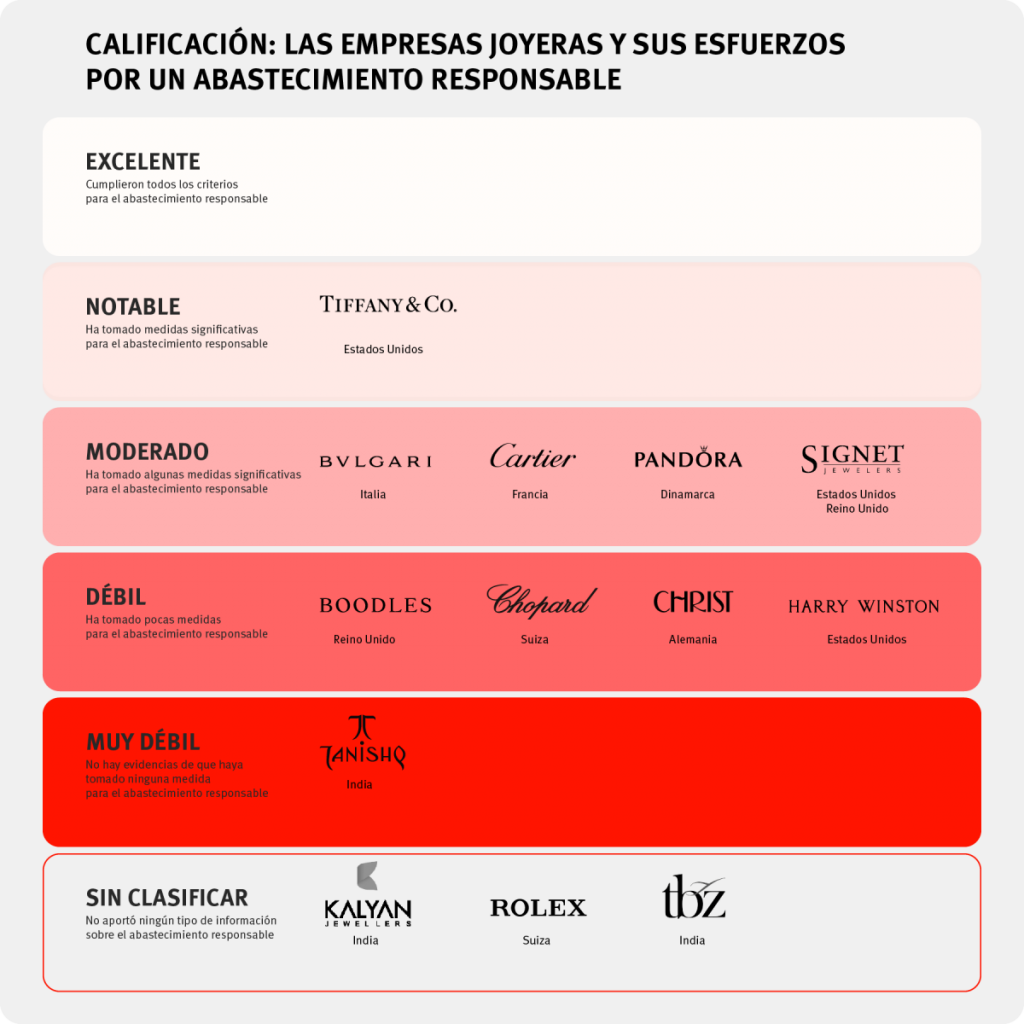 Según Human Rigths Watch ninguna de las trece empresas son clasificadas como excelentes, pero Tiffany and Co, fue posicionada como sólida por tomar medidas para asegurar un abastecimiento responsable: