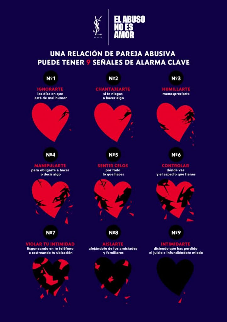 Las investigaciones muestran que la violencia de pareja viene con señales de alarma clave. Si estas señales pueden ser detectadas rápidamente, podríamos reconocerlas mejor y buscar u ofrecer ayuda. YSL Beauty apunta hacia hacer su parte para crear conciencia sobre estas comunes señales.