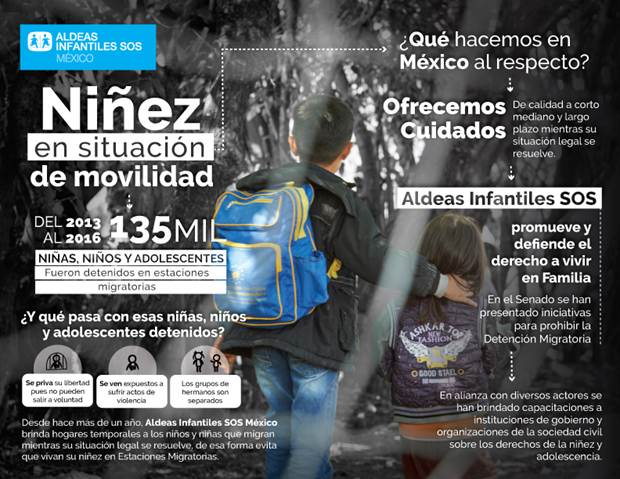 Desde hace algunos años, Aldeas Infantiles SOS México brinda hogares temporales a los niños y niñas que migran mientras su situación legal tiene una solución, de esta forma se evita que los niños vivan ese tiempo en estaciones migratorias y por lo tanto sean vulnerables al maltratos físicos o psicológicos y que pongan en riesgo su vida.