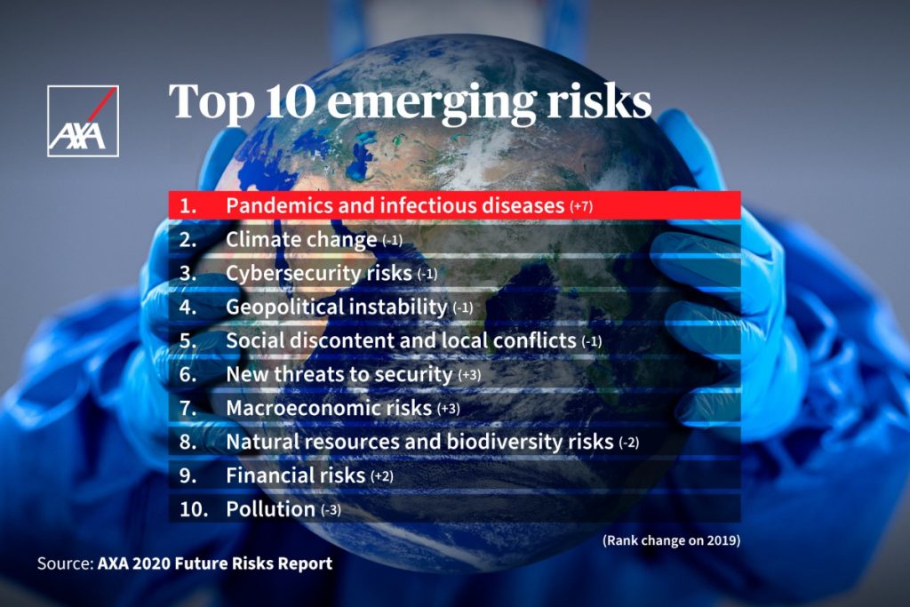 En el reporte, los riesgos relacionados con pandemias y enfermedades infecciosas, que antes ocupaban la octava posición del ranking, este año lo encabezaron desplazando al cambio climático a la segunda posición y a la ciberseguridad, a la tercera.