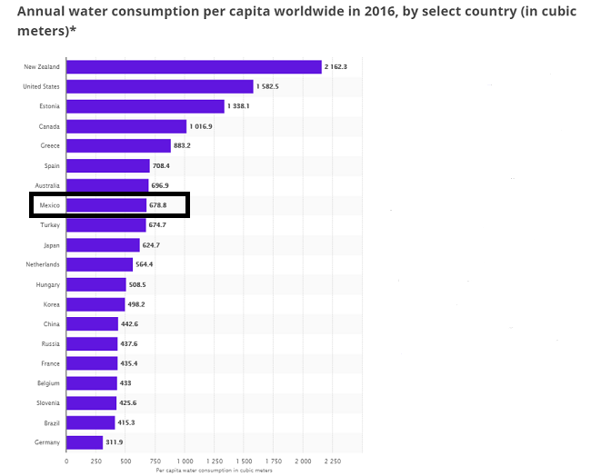 ¿Cuánta agua utilizamos en México? Con 366 litros diarios por habitante en promedio, el país figura entre los países que más consumen agua en 2017 de acuerdo con un reporte del Foro Económico Mundial, siendo la CDMX la que tiene los mayores problemas de abastecimiento.