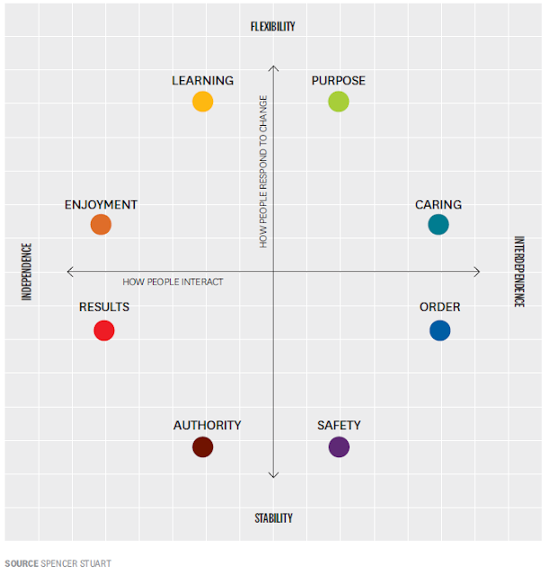 Propósito: se ejemplifica por el idealismo y el altruismo. El ambiente laboral es tolerante, compasivo, donde la gente trata de hacer el bien para el futuro del mundo. El personal tiene en común su enfoque hacia la sostenibilidad y hacia la comunidad global y los líderes enfatizan los ideales compartidos y la contribución al bien común.