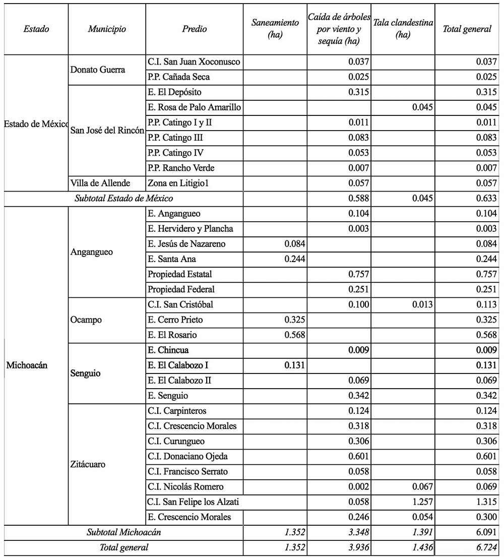 No obstante que la degradación disminuyó, la tala clandestina pasó de 0.6 ha en 2016-2017 a 1.4 ha en 2017-2018, concentrada principalmente en la comunidad San Felipe de los Alzati, en Zitácuaro, Michoacán, donde un debilitamiento de la cohesión social provocó la tala de 1.2 ha. También la sequía que afecta a la región desde hace varios años causó estragos en 3.9 hectáreas, casi el triple que el periodo anterior, a lo que se suman 1.4 ha en las que se realizaron trabajos de saneamiento forestal.