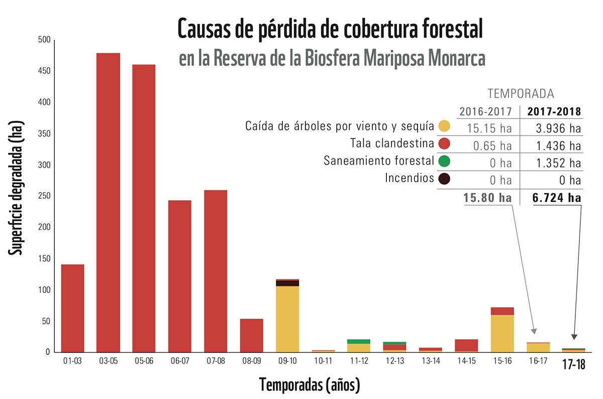 La zona núcleo de la Reserva de la Biosfera Mariposa Monarca sufrió afectaciones en 6.7 hectáreas (ha) de bosques entre febrero de 2017 y marzo de 2018, lo cual representa una reducción del 57.6 % respecto a las 15.8 ha degradadas durante el periodo 2016-2017, de acuerdo con el monitoreo forestal realizado por la Alianza WWF-Fundación Telmex Telcel, la Comisión Nacional de Áreas Naturales Protegidas (CONANP) y el Instituto de Biología de la Universidad Nacional Autónoma de México (UNAM).