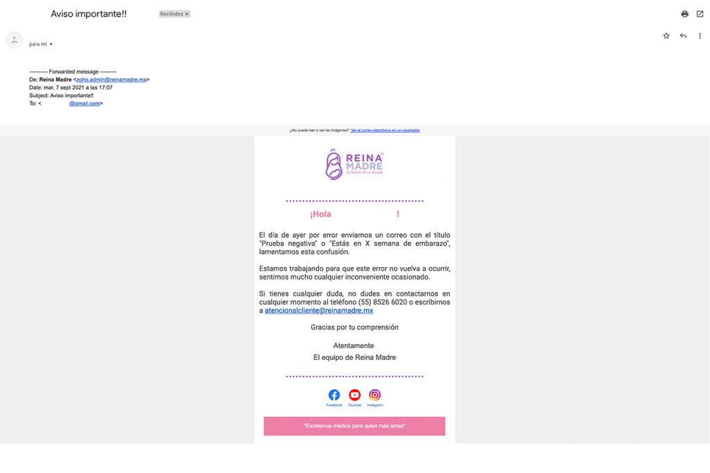 “(Nombre y apellido) ¡Estás en la semana 5 de embarazo!” fue el subject personalizado con el que la clínica Reina Madre tituló un correo electrónico que envió a cantidad de mujeres el día lunes 6 de septiembre de 2021 para notificar, sin distinción, que algunas de sus usuarias se encontraban embarazadas. Esto también sin importar si ellas se habían realizado exámenes de este tipo.