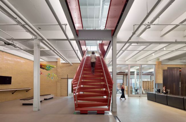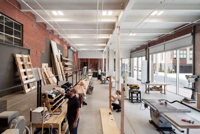 La firma de arquitectos KieranTimberlake transformó una planta embotelladora de cerveza en un estudio que es a la vez un laboratorio de fabricación, tienda de modelismo y zona de descanso.