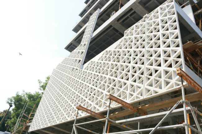 Ya que los planos de la sede están basados en el concepto de “edificios que respiran”, su característica central es una piel externa compuesta de elementos prefabricados de alta calidad que conducen el aire frío exterior hacia una chimenea solar interna.